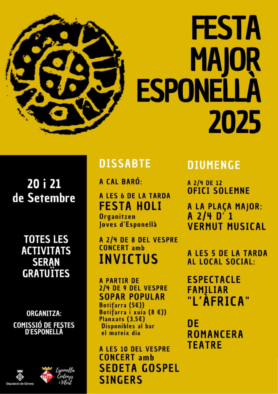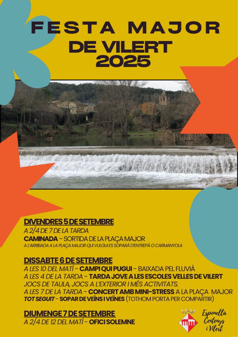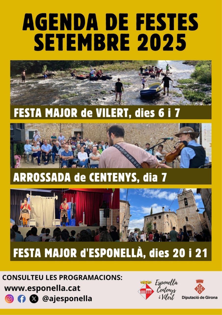 Bon dia, aprofiteu aquest mes d’agost per a descansar perquè el setembre arribarà carregat de festes al municipi! -Festa Major de Vilert: 6 i 7 de setembre-Arrossada de Centenys: 7 de setembre-Festa Major d’Esponellà: 20 i 21 de setembre