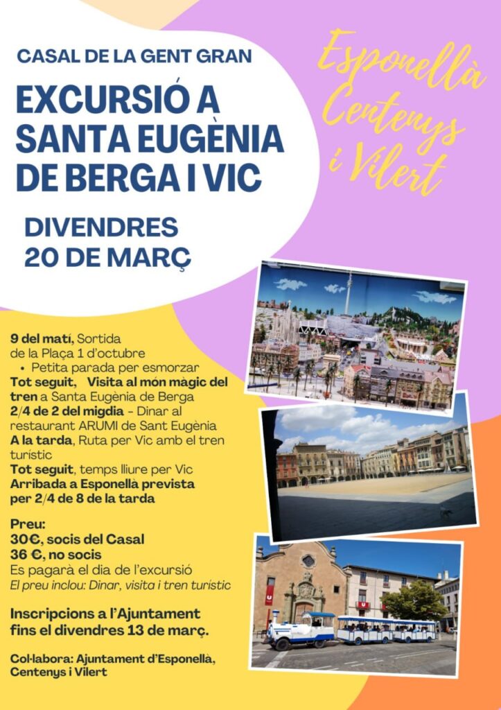 El proper divendres 20 de març , el Casal de la Gent Gran d’Esponellà organitza una excursió a Santa Eugènia de Berga i a Vic . Podeu apuntar-vos presencialment, via mail o WhatsApp a l’Ajuntament fins divendres 13 de març.